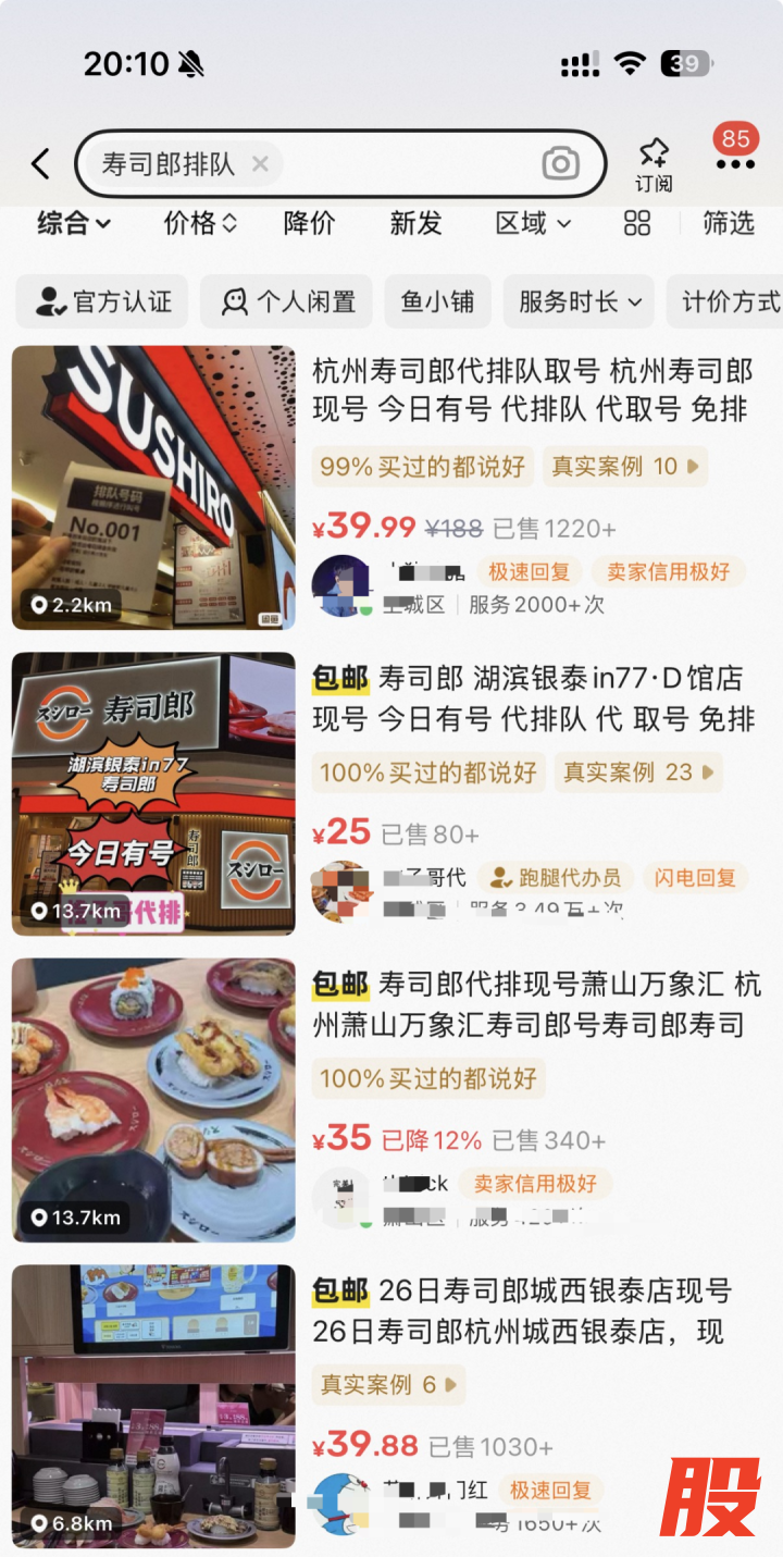 二手交易平台显示,寿司郎“代排队”价格普遍在30元-50元不等。有些价格甚至达到150元-300元。