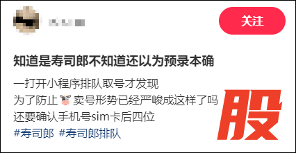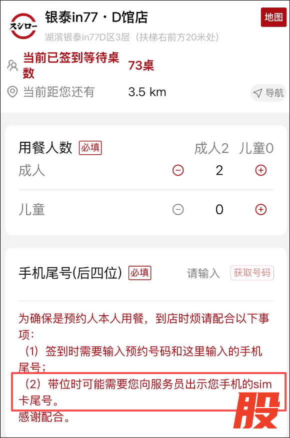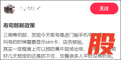近日,有网友发文称,在寿司郎小程序预约取号后,到店签到需要核验手机尾号后4位,并出示手机SIM卡尾号。